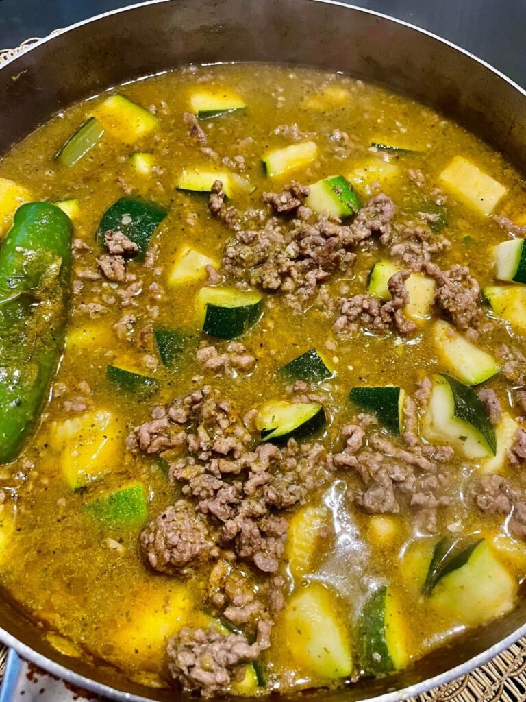 Ingredients: 2 lbs of 90/10 ground chuck salt onion powder pepper 1 1/2 cups of water 1 tbsp of chicken bouillon 4 medium zucchini, sliced 1/8″ thick Salsa: 3 tomatoes …