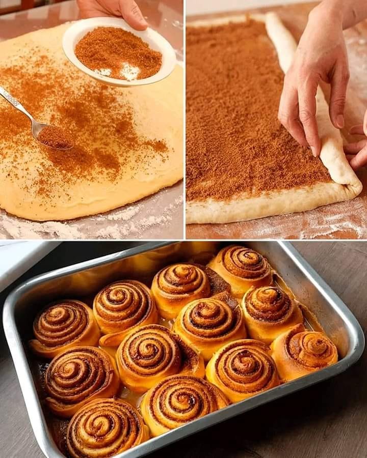- Spread the softened butter over the dough and sprinkle with brown sugar and cinnamon.
