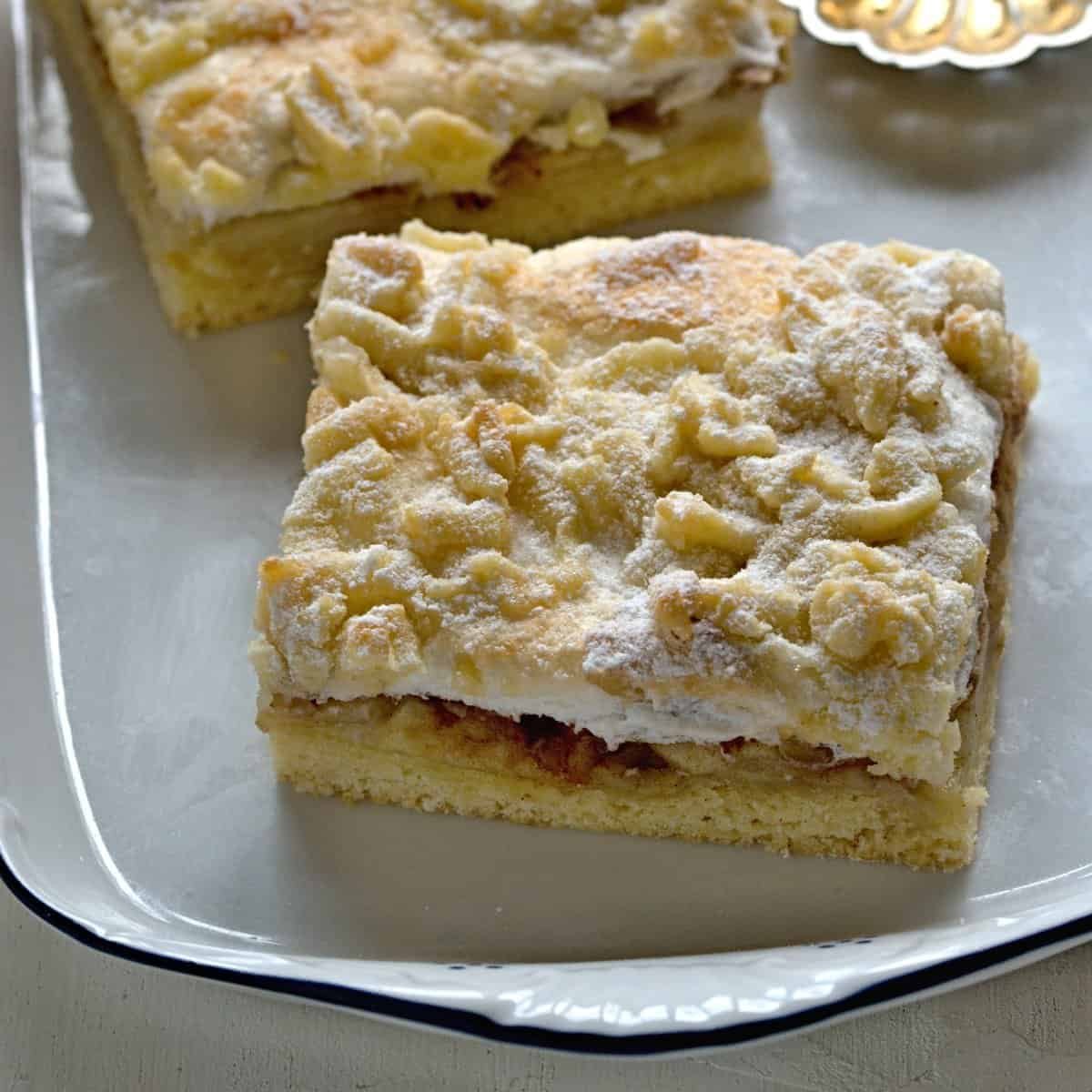 Cremeschnitte is a classic pastry from Austria and Croatia that consists of layers of puff pastry and a creamy vanilla custard filling. This dessert is topped with powdered sugar and typically served in rectangular slices.