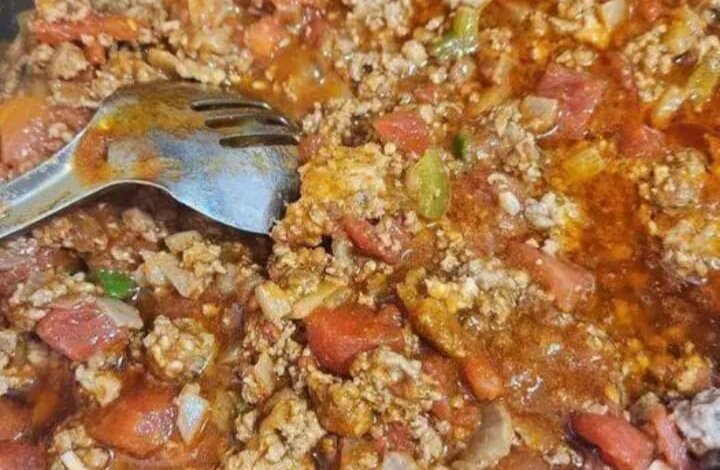 Add ground beef or turkey to pan with onions and peppers. Cook over medium heat, breaking ground beef or turkey. When meat is cooked, drain fat.