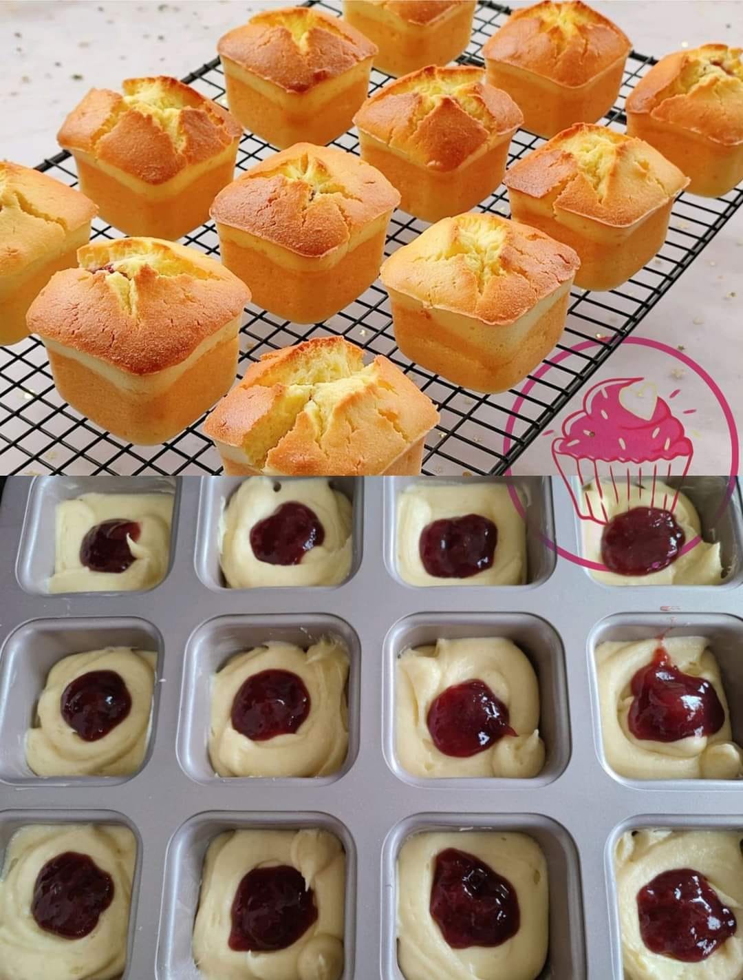 To add flavour, add one tablespoon of vanilla extract and mix for a minute. Pour the batter about a quarter full into the baking mould and add strawberry jam then add more batter to fill the jam to about three-quarters full in the mould. Repeat the same in each of the cake moulds until the batter is finished.
