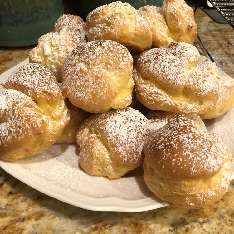 Mouthwatering cream puffs filled with fluffy whipped cream and dusted with powdered sugar.