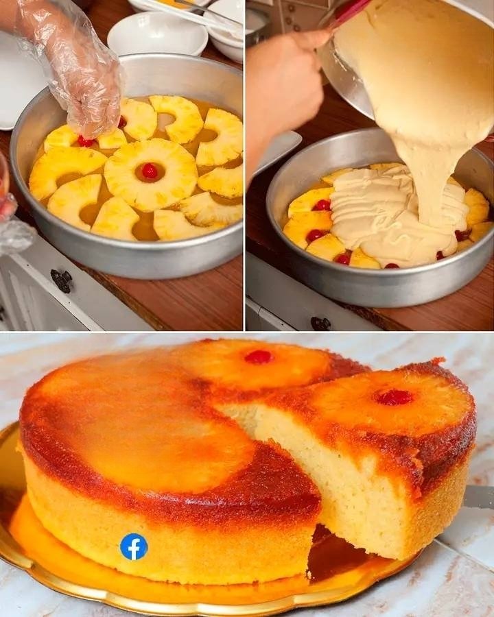 Invert the cake onto a serving plate. Slice between the pineapple rings and serve warm or room temperature.