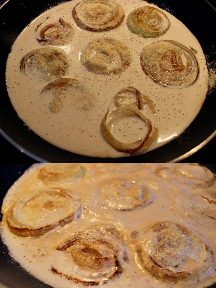 - Slowly pour the cream mixture over the onions and sprinkle with the parmesan cheese