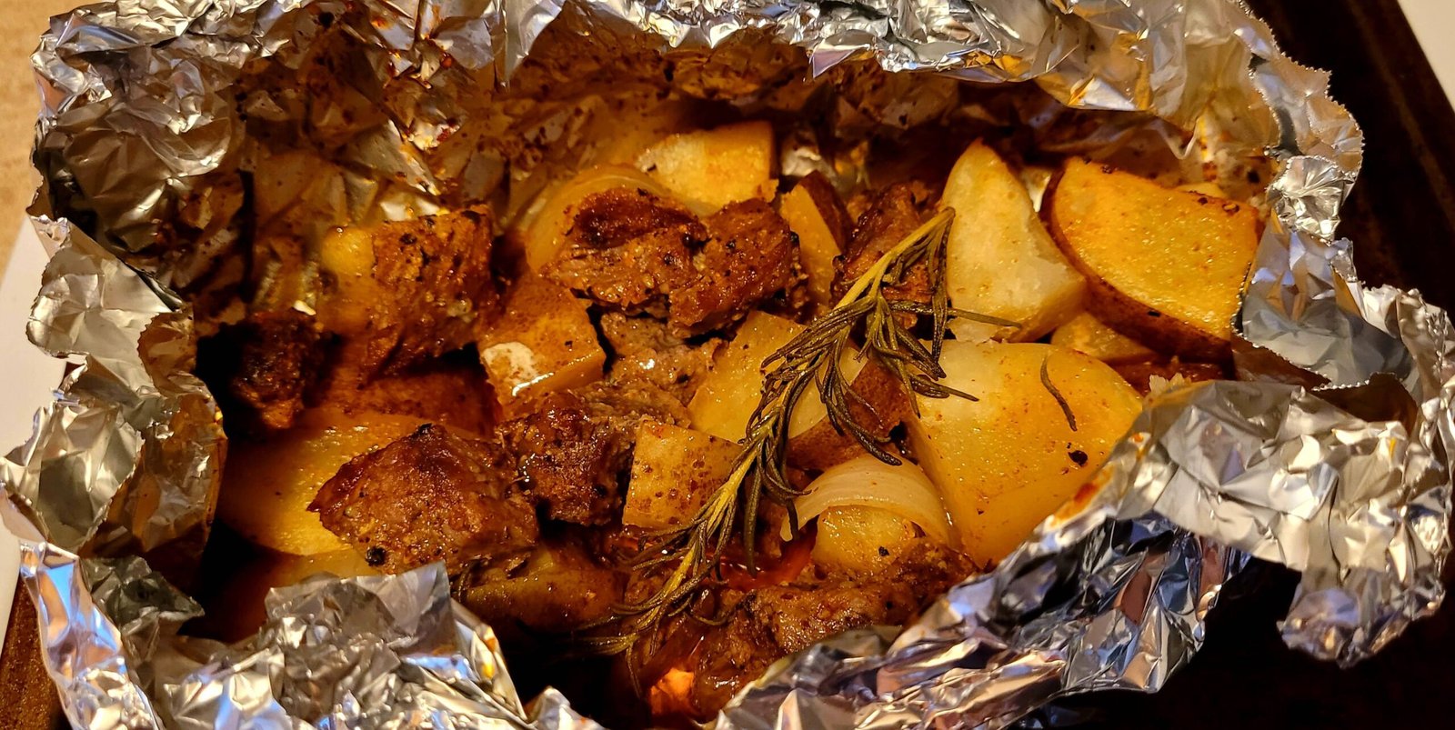 - In a bowl, mix steak, potatoes, olive oil, garlic, and seasonings.